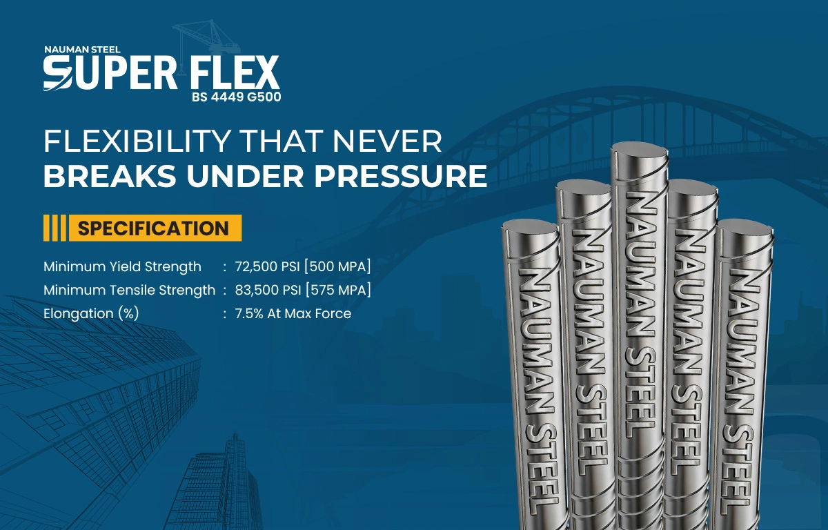 NS Super Flex is designed for projects that require compliance with international specifications and dependable structural performance. It provides consistent strength and integrity, making it suitable for infrastructure developments, large-scale projects, and structures built under UK and international standards. Engineers and consultants prefer this grade where reliability and specification compliance are essential.